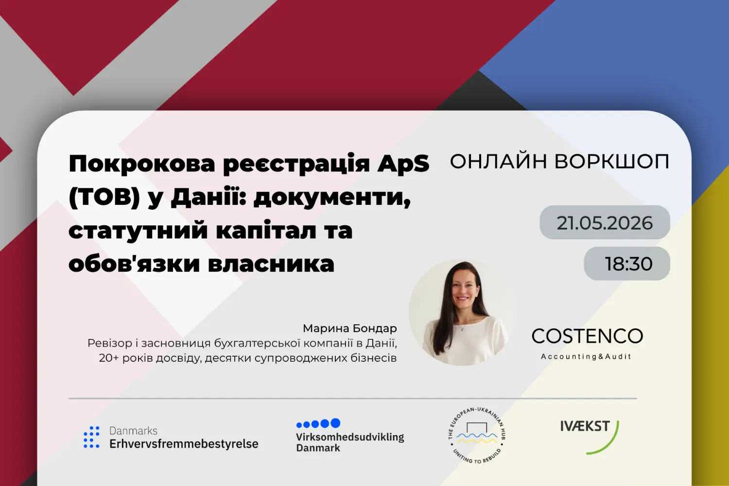Спікерка: Марина Бондар — ревізор з понад 20-річним досвідом у фінансах та бухгалтерії, з яких останні 10 років працює в Данії. Засновниця COSTENCO ApS — данської бухгалтерської компанії, що спеціалізується на супроводі малого та середнього бізнесу. Супроводжувала десятки підприємців при відкритті та закритті компаній, має практичний досвід проходження податкових і аудиторських перевірок.
