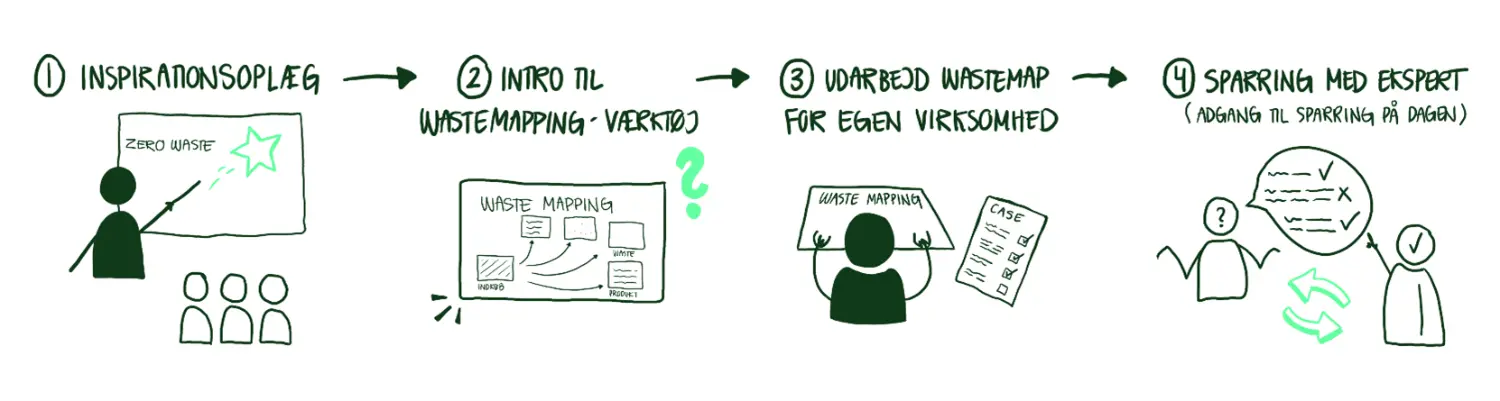 Du arbejder med din egen virksomhed og får samtidig mulighed for at dele erfaringer, udfordringer og løsninger med andre virksomheder, som står med lignende problemstillinger. Erfaringsudvekslingen er en aktiv del af workshoppen og giver nye perspektiver og idéer til netop din virksomheds affalds- og reststrømme.