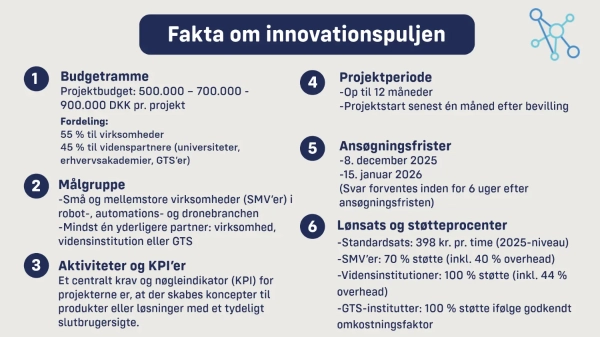 Formålet med puljen er at understøtte innovationsparate SMV’er i robot-, automations- og droneøkosystemet, der ønsker at udvikle nye løsninger med kommercielt potentiale — løsninger, som både kan styrke danske virksomheders konkurrencekraft og bidrage til øget automatisering i bredere dele af industrien.