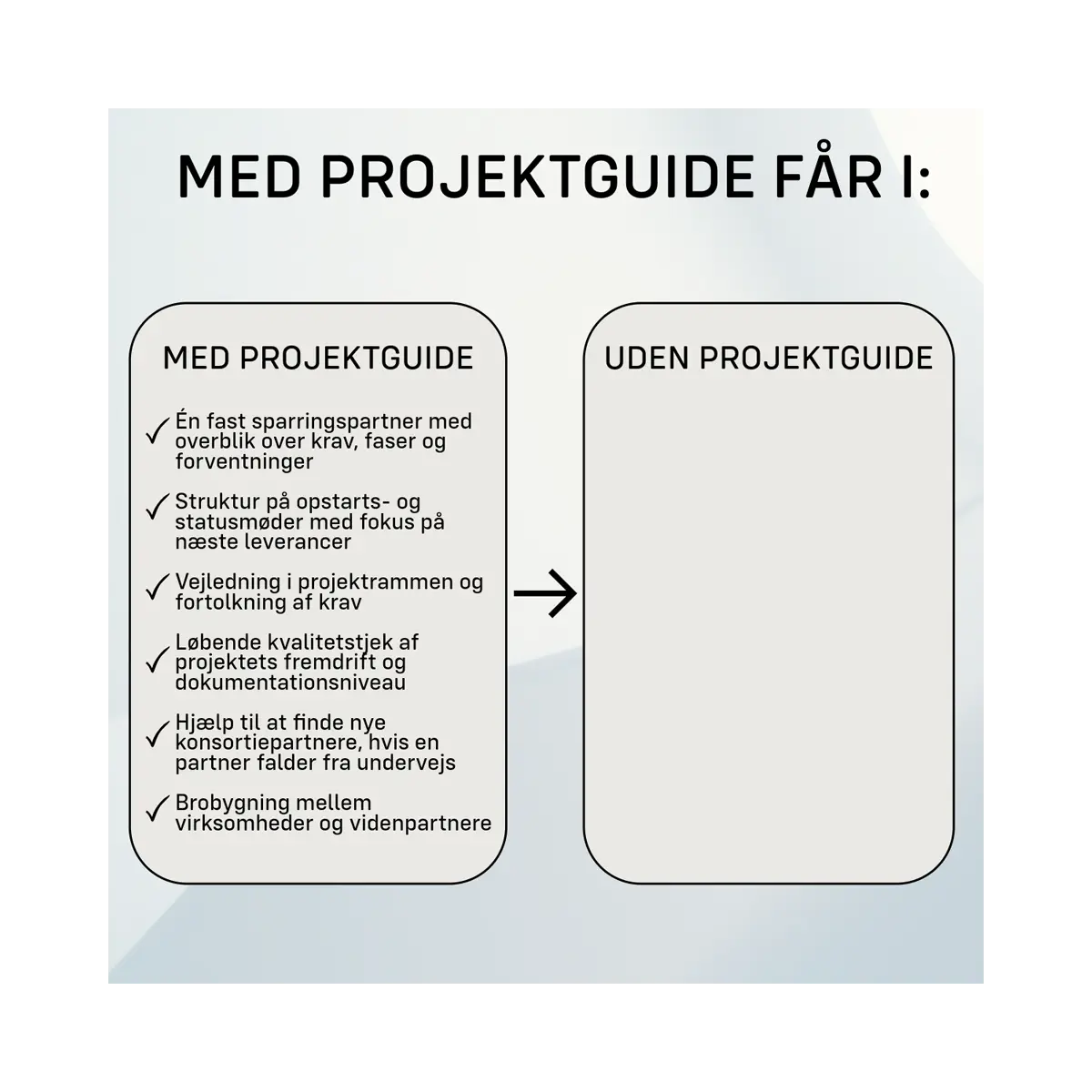 - Skabe klarhed over projektets faser, milepæle og dokumentationskrav - så I ved præcis, hvad der forventes, og hvornår.