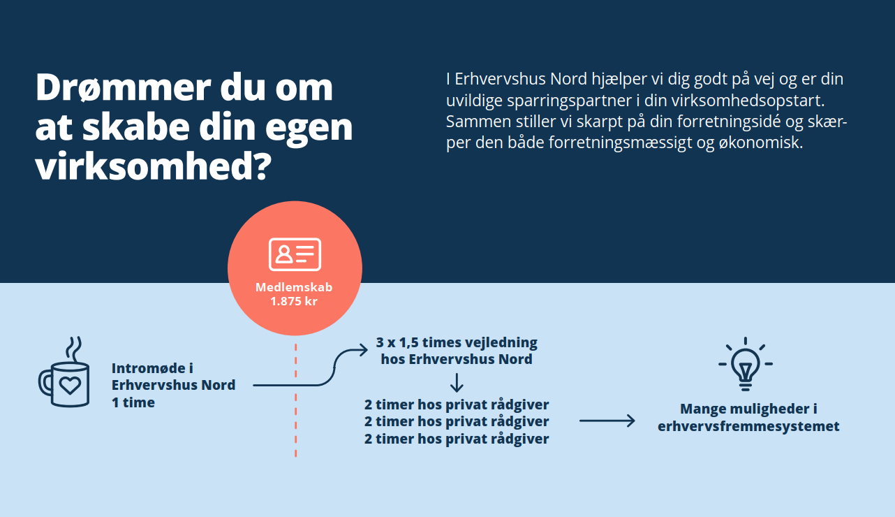 I vores iværksætterpakke er der et intromøde af én time, som er gratis. Ønsker du at gå videre, kræver det indmeldelse i enten Skagen, Frederikshavn eller Sæby Erhvervsforening. Derefter får du adgang til StartUp Club. Her får du 3 x 1,5 times vejledning hos en af vores erhvervskonsulenter samt adgang til to timers vejledning hos tre private rådgivere fx revisor, advokat, markedsføring, som står til rådighed i StartUp Club.